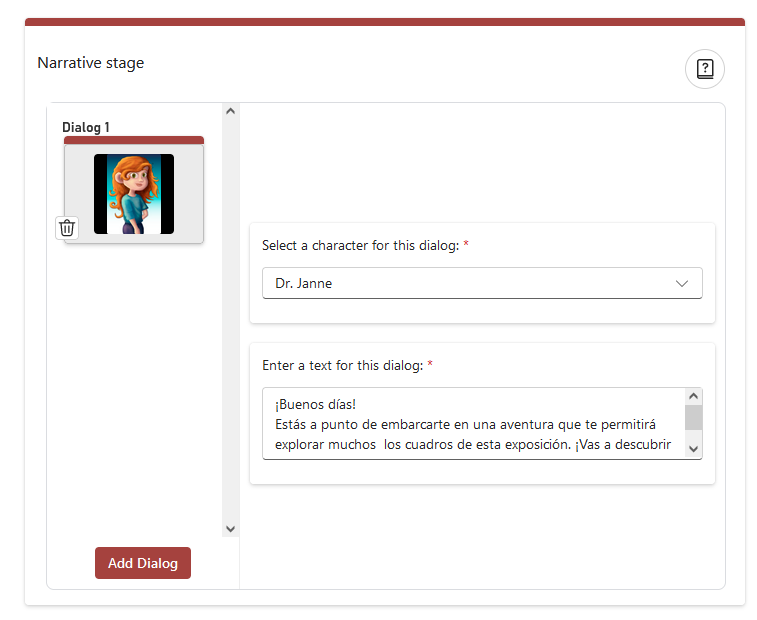 El botón “Add Dialog” incorpora una nueva página del diálogo, donde se configura el texto y el personaje que lo dice. Se pueden añadir tantas páginas como se necesite.